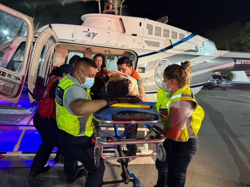 Gracias a la inmediata respuesta de los cuerpos de emergencia y al uso del helicóptero municipal —adquirido como parte de la histórica inversión en seguridad y protección civil impulsada por el gobierno de la presidenta Estefanía Mercado—, se logró trasladar vía aérea a un lesionado hacia el hospital general de zona del IMSS No. 18 de Playa del Carmen.