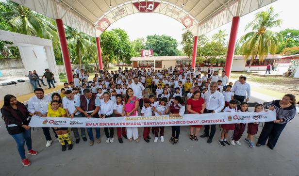 Chetumal.- Con más de cinco décadas de espera, hoy las y los estudiantes de la escuela primaria “Santiago Pacheco Cruz”, en la ciudad de Chetumal, cuentan con un domo escolar digno y seguro, el que les fue entregado por la gobernadora Mara Lezama Espinosa durante un emotivo evento.