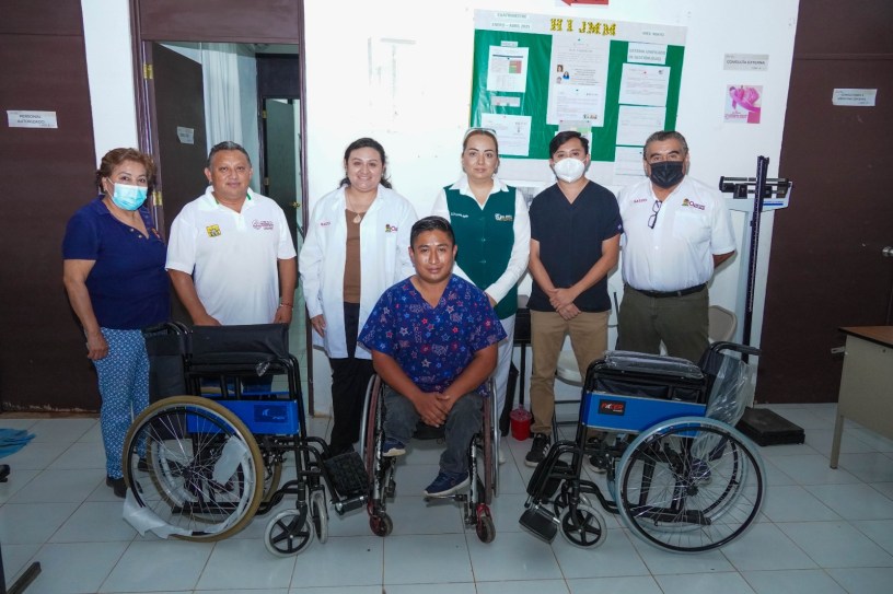 Acompañado de la Directora de Secretaria de Salud Municipal, Clarita Inés Vázquez Chan, del Coordinador General de Gabinete, Oswaldo Peralta Torres y de otras autoridades locales, el edil entregó sillas de ruedas con el objetivo de reforzar el servicio público gratuito.