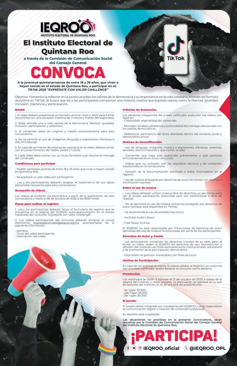 Chetumal, Q. Roo, julio de 2025. — El Instituto Electoral de Quintana Roo (IEQROO) invita a las juventudes entre 18 y 29 años a participar en el #TikTokChallenge “Exprésate con valor”, un concurso que premia la creatividad, el compromiso social y la expresión libre a través de videos cortos.