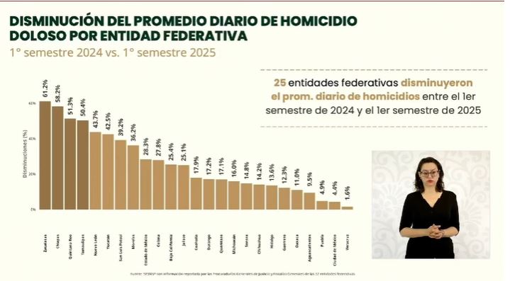La información fue presentada por Marcela Figueroa Franco, titular de la Secretaría Ejecutiva del Sistema Nacional de Seguridad Pública, durante la Conferencia del Pueblo encabezada por la presidenta Claudia Sheinbaum, donde se detallaron los avances en materia de seguridad a nivel nacional.