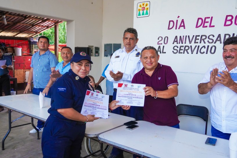 En la ceremonia se entregaron distinciones especiales: al primer bombero del municipio, Arturo Pérez Méndez, por sentar las bases de la institución; y a la bombera Cecilia Angulo Pat, por su destacada participación en cursos de formación especializada.
