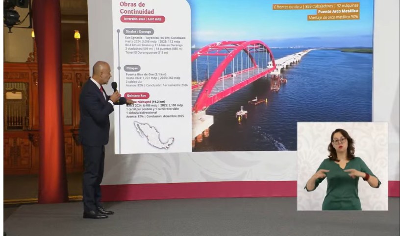 Ciudad de México.– El Gobierno Federal confirmó que en diciembre de 2025 se inaugurará el Puente Vehicular Nichupté, una de las obras de infraestructura más importantes en la historia de Cancún, con un avance físico del 87%.