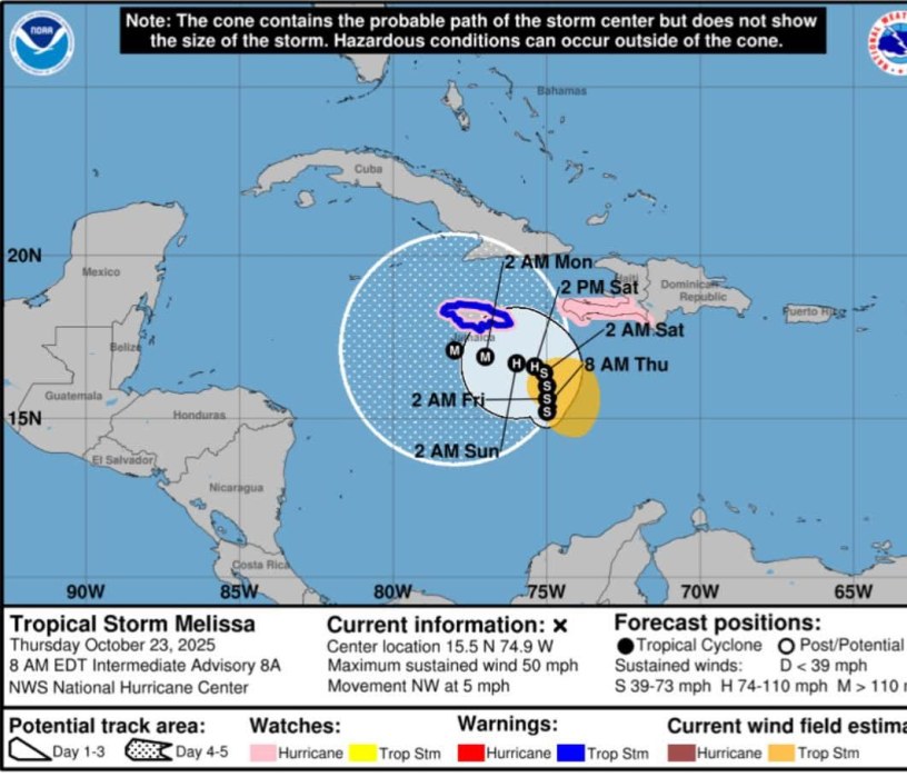 El movimiento lento y errático del sistema mantiene la atención de los países del Caribe, ante la posibilidad de que “Melissa” se intensifique en los próximos días y alcance la categoría de huracán, especialmente al interactuar con la Onda Tropical No. 39, que también se desplaza en la región.