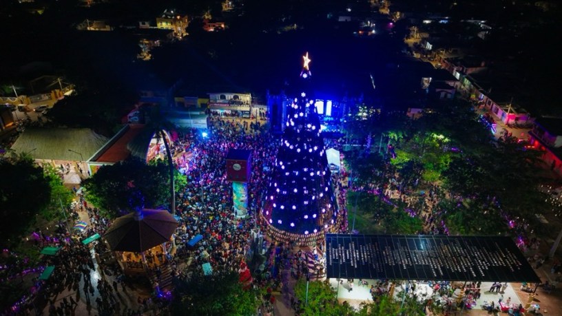 José María Morelos, Quintana Roo, 4 de diciembre de 2025.— Un ambiente de fiesta, luces y alegría se vivió en el Parque Forjadores del “Kilómetro 50”, donde más de 10 mil familias se congregaron para celebrar el tradicional encendido del árbol navideño encabezado por el presidente municipal Erik Borges Yam.